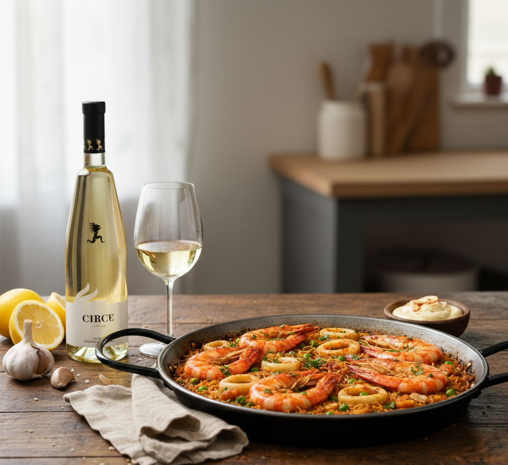 Avelino Vegas Circe Verdejo Rueda is ideal for this dish. Its crisp citrus and green apple notes complement the saffron and seafood perfectly, while its medium acidity refreshes the palate between bites.
